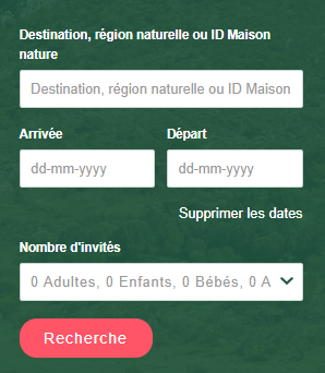Sous Destination, zone naturelle ou code maison, vous pouvez saisir un pays, une région ou une ville. Si vous recherchez une maison de la nature spécifique, vous pouvez y saisir l'identifiant à cinq chiffres de la maison, ce qui vous conduira directement à la page de cette maison de la nature.