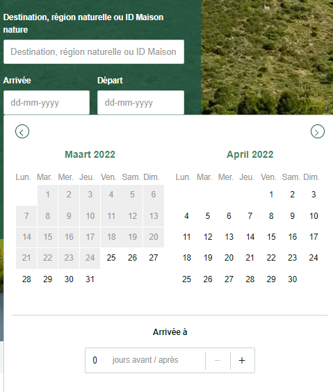 À l'arrivée et au départ, vous pouvez saisir la période souhaitée. Vous pouvez ensuite sélectionner un jour d'arrivée et un jour de départ. Si vous êtes un peu plus flexible en ce qui concerne les jours d'arrivée, vous pouvez indiquer combien de jours plus tôt vous souhaitez arriver.